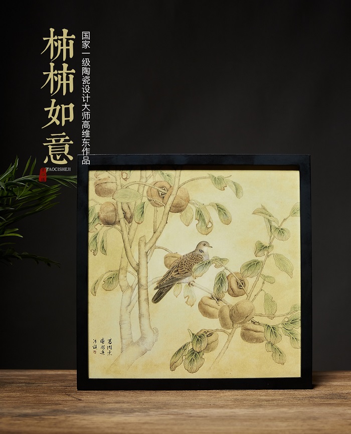 该作品采用釉中炫彩工艺,画面绘有秋天柿子丰收图景,鸟儿小憩其中,俨然一幅大自然秋色画卷。该画采用小品形式,规格为26*26厘米,纤薄瓷板与实木框架,让作品更具质感。