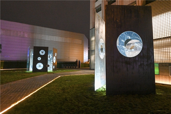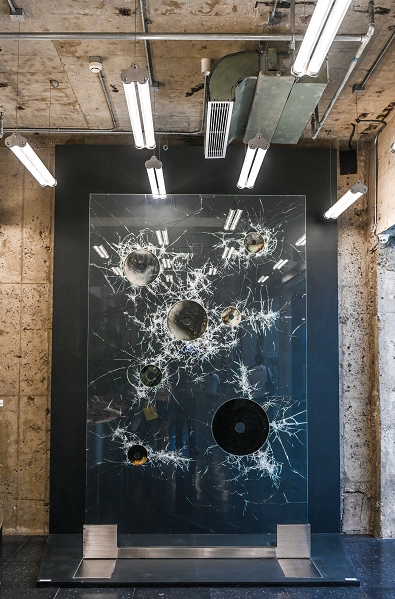 《玉璧—星空》是赵赵的代表作,也是《星空》系列的延续。在《星空》中,由于未知的冲击而形成的中心是一片虚空的黑色,而在这件全新的装置作品里,赵赵将中国玉璧这个礼器的元素,替换成玻璃或钢板,将冲击与虚空再次被放大,使它与这座城市、建筑、夜色产生了一种奇妙的对话关系。