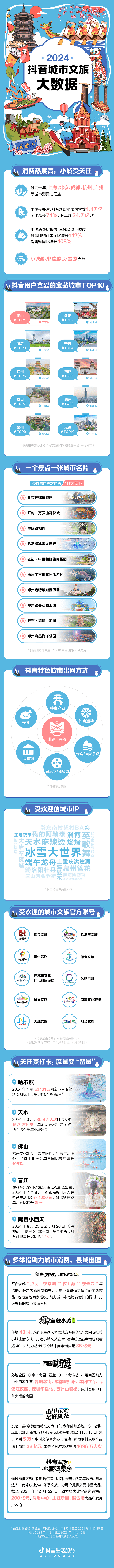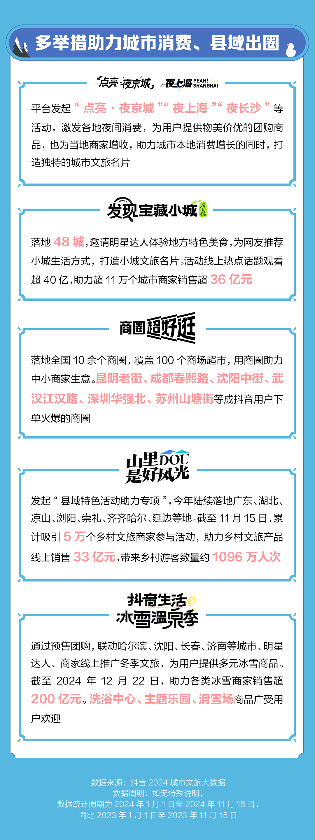 抖音生活服务城市营销相关负责人介绍,过去一年,平台发起“点亮·夜京城”“夜上海”“发现宝藏小城”“商圈超好逛”“山里DOU是好风光”“抖音生活温泉冰雪季”等活动,联合各地政府、明星达人、商家,通过线上宣推、线下发起大事件等形式,助力城市文旅消费、小城出圈。未来,平台会结合各类活动和节日假期,在各地政府、达人用户和商家共同蓄力下,助力更多地域出圈,激发更多城市消费。